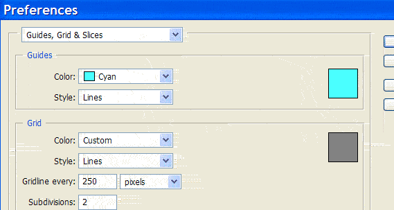 Для начала нам понадобится немного настроить Фотошоп. Зайдем в раздел Edit – Preference – Guides, Grid & Slices. Здесь нам нужно будет выставить настройки для Линеек. Gridline every — устанавливаем значение в 250 пикселей, Subdivisions — значение 2.